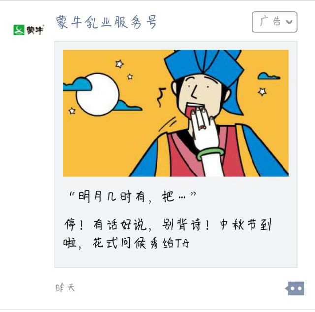 在双节前夕,广告多的数不胜数,但是怎样入了用户的眼,是广告主们feed流广告头疼的一件事情,怎样能够吸引用户呢?不要急,下面带大家看一则蒙牛乳业的广告案例,这个创意可以说是非常的优秀了。 下图是一张蒙牛乳业在朋友圈中投放的信息流广告,单纯看起来是跟其他的信息流广告没有什么区别,也是一张图片加上文案,是一种比较常见的方式。