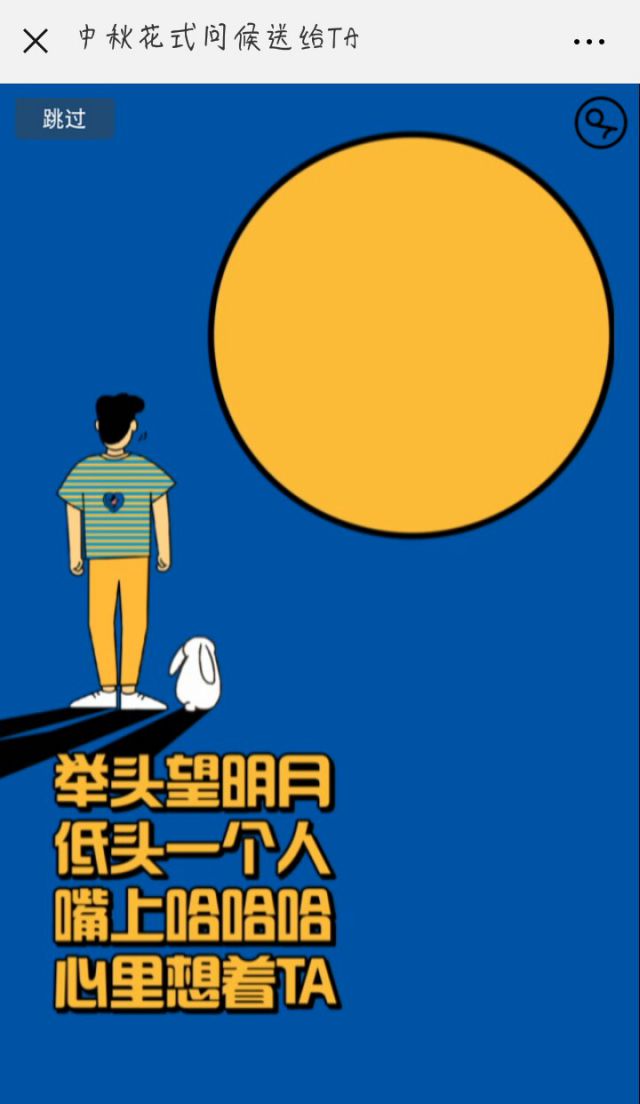 但是点开之后的落地页是非常震撼的,(看下图)借助中秋节的来进行营销,花式问候把我们都给吸引住了,改变了一首李白的《静夜思》,但是这首诗的含义我没有看懂,不知是说思念亲人,还是说你们这群单身狗,哈哈。点击跳过是一个选择页面,选择你想的那个ta然后可以进行分享,这就在一定程度上促进我们广告的宣传,进行朋友与朋友之间的一个传播。