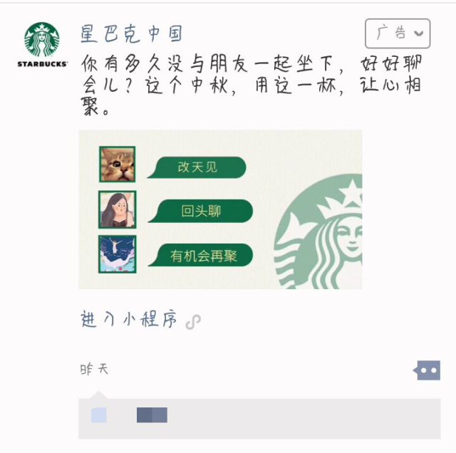 在中秋的话题上,广告主们永远不忘记如何策划我们的广告,星巴克借势中秋,打了快手直播一手感情牌。文案是“你有多久没与朋友一起坐下,好好聊会儿?这个中秋,用这一杯,让心相聚”,这个文案一出现,引发了众多人的深思,暗中反问自己,到底多久了。 广告的形式是一则动图,我截取的是动图的第一个画面,图片上是“改天见,回头聊,有机会再聚”三句短短在正常不过的话,却能引起众多人的共鸣。广告推广的是一则小程序,点击进入小程序,不仅仅推广了我们的小程序,也宣传了我们的品牌的知名度,一举两得。