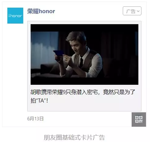 华为荣耀是为旗下的互联网手机品牌,产品追求更酷的,更极致体验。 为推广新品荣耀9手机,荣耀选择与腾讯社交广告合作,投放微信朋友圈基础卡片广告。广告针对荣耀9的特色和品牌主张,邀请胡歌拍摄了一则悬念短片,利用卡片广告震撼的展示效果及丰富的组件,吸引用户投入体验产品。 投放目标 凸显新机亮点,为荣耀9上市造势引流 荣耀此次投放主要是为了宣传新机荣耀9。作为荣耀的年度重要产品,荣耀9需要定向瞄准目标用户,快速有效的传达新产品的亮点信息,向用户展现新产品的功能,达到引起用户对荣耀9产品饭馆营销方案的关注效果。朋友圈卡片式广告的推广,将荣耀9的新机优势展示在每一个用户面前。通过的精准定向,将新机信息传递到每一个目标受众人群的微信朋友圈里。 投放方案