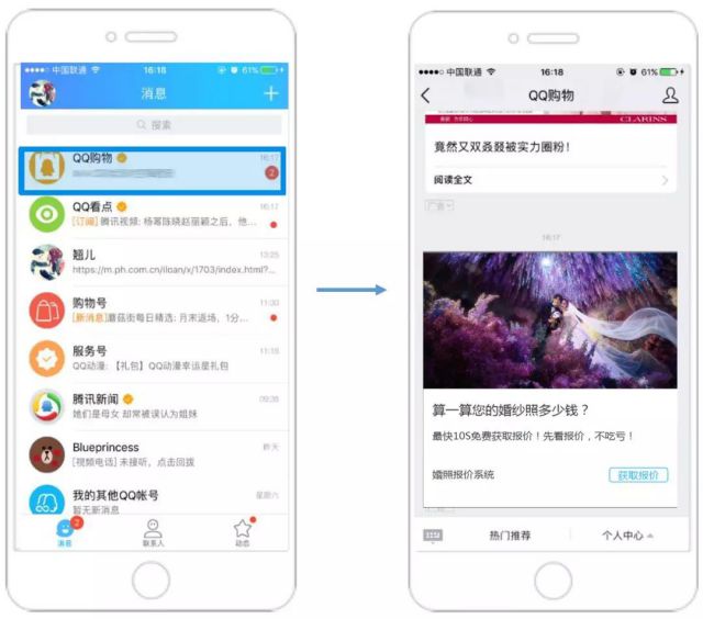 QQ购物广告形态示意 同时杭州金夫人婚纱摄影充分利用QQ购物号的强购物营销场景,使用赏心悦目的广告素材并打出直击消费者痛点的“价格牌”,吸引用户点击广告进入落地页。在落地页中,仅需用户填写2个简单的问题,便可点击“获取报价”按钮提交信息,这样简洁的操作,帮助杭州金夫人婚纱摄影有效吸引用户下单,提升转化率,最终单条广告日均阅读率达到2%—4%,并达到了日均收集线索140个的优异效果。