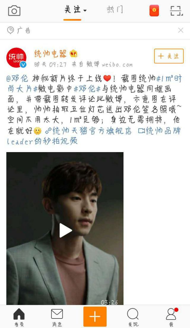 微博平台本身用户群体非常多,适合广告的传播,并且可以与广告进行互动,拉进距离。在一定的互动效果下,广告也进行了核裂变式的传播,有效的宣传了我们的广告;微博广告根据用户的标签进行定位,广告主可以选择认央视最新的广告有哪些为觉得有兴趣的用户进行广告的投放,引进更多的潜在用户,提高广告的点击率;微博平台最大的优势就是利用明星进行广告的传播,刚好统帅电器找了邓伦进行广告的代言,非常的优势。