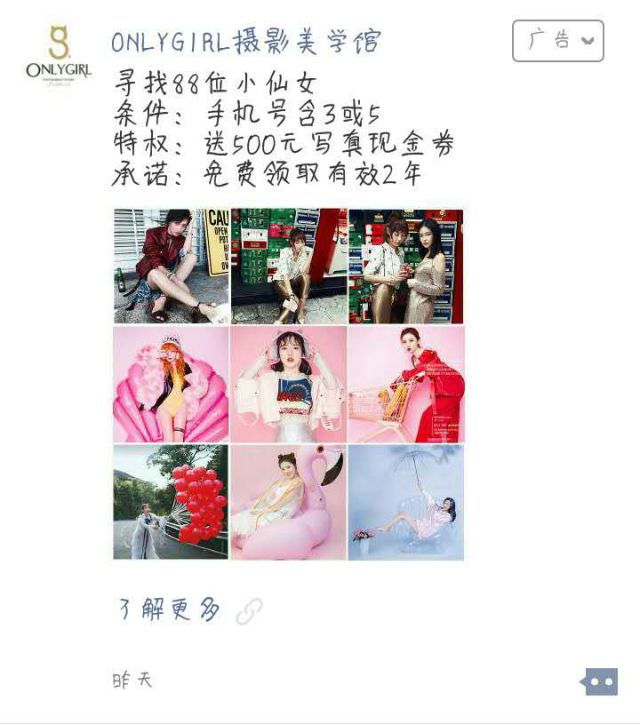 上图是ONLYGIRL摄影在微信朋友圈上投放的一个信息流广告,广告采用常见的九宫格方式向大家呈现,广告的文案也是非常的吸引用户。文案内容介绍这次活动,简洁明了让用户知道是什么意思,图片也从不同的角度展示出不同的风格类型,给人视觉上的体验。 下图是ONLYGIRL摄影的落地页面,点击了解更多,跳转到我们的落地页。落地页面也非常的简单,只有登记领取和预约,但是把福利写得很清楚,给人直观不杂乱的感觉。