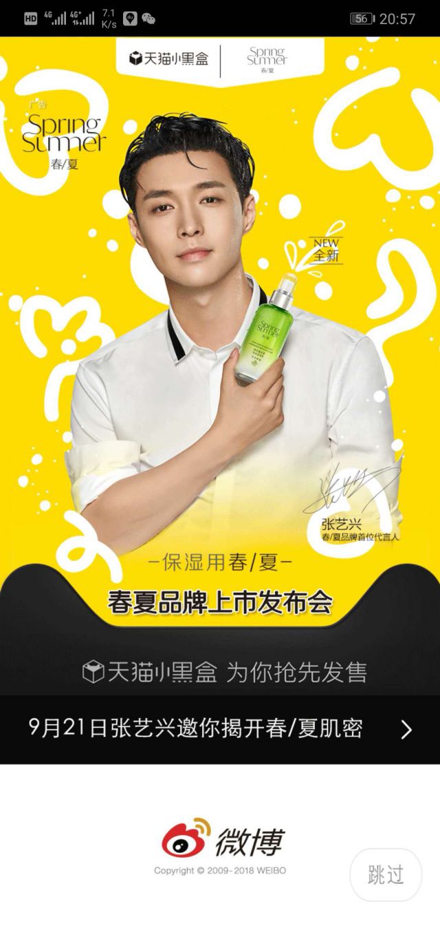 春夏这个品牌应该很少人知道,小编也是第一次见到,作为一个广告人,每天必备的就是刷广告,微博开屏广告一般都是我们相对来说比较熟悉的品牌,所以作为一个广告人都不怎么见过的这个牌子的广告,你说说是不是应该早点投放开屏广告里了。 春夏品牌主打的应该就是他们家sem运营的保湿水黄绿粉紫青不同颜色不同功效,这则广告中整个广告画面采用非常亮眼的黄色为背景,春夏我们首先想到的是什么,一片生机盎然,此次广告主要是为了宣传春夏品牌上市发布会,张艺兴的努力上进和它代言的春夏品牌十分契合,作通过315看危机公关为伽蓝集团旗下的第五大品牌,历时多年精心打造,春夏品牌同样担得起“努力”二字。