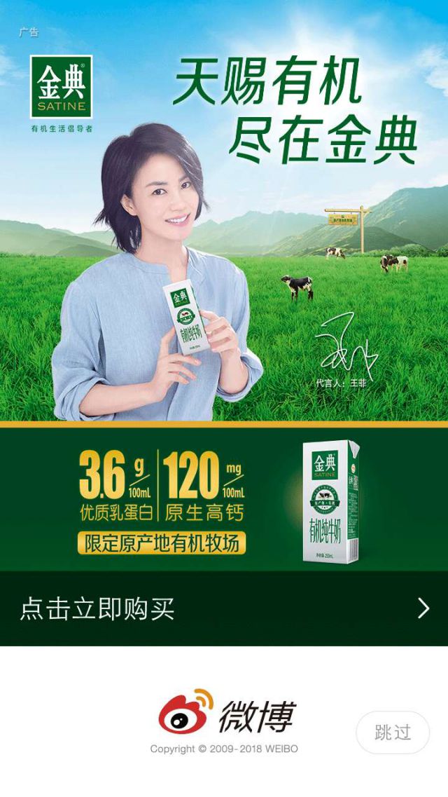 金典牛奶诞生于2007年,作为伊利牛奶的高端副品牌开始上市,自上市起,一直秉承着奉献最佳品质的理念,致力于打造中国最好的牛奶,主要有网络推广方式三支单品金典纯牛奶、金典低脂奶、金典有机奶。其中金典有机奶自产发以来,就一直受到大家的喜爱,有机奶是按有机标准生产,并经第三方严格认证的“最健康,最天然,最安全”的奶制品,是最好的牛奶,有机奶强调的是 “纯天然无污染”。 金典有机奶找的代言人是天后王菲,广告图片的背景是牧场,体现出金典天然、无污染的特点。右上角有显著的金典logo,文案是“天赐有机,尽在金典”。下面是金典有机奶的一些配置含量,展现给葆蝶家用户,取得用户的信任。 微博开屏广告的特点:1、开屏广告是进入APP的唯一通道,是每个打开APP的用户都需要看到的一则广告,对于品牌的宣传有很大的帮助; 2、开屏广告占据了整个屏幕,给用户视觉性的冲击,在刚打开APP的时候用户注意力比较集中,容易抓住用户的眼球,吸引用户记住我们的广告,另外开屏广告全屏幕均可点击,从而提升广告的转化效果; 3、通过人口属性、用户行为、商业兴趣等丰富的定向体系,精准的进行广告的投放,尽可能给广告主提供有利的效果。