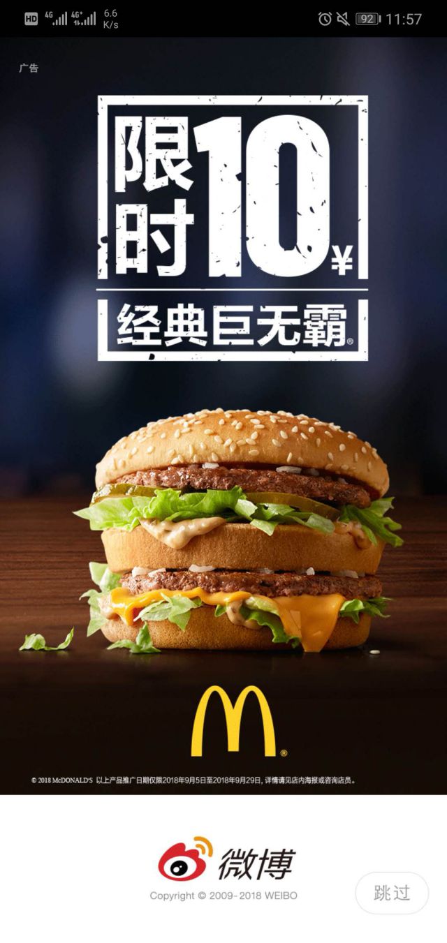 说到吃的,我想没有比中国人更厉害的了,什么都敢吃,没什么不能吃,麦当劳是全球网络营销直销信息流ocpc大型跨国连锁餐厅,1955年创立于美国芝加哥 ,在世界上大约拥有3万间分店。主要售卖汉堡包,以及薯条、炸鸡、汽水、冰品、沙拉、水果等快餐食品。 麦当劳的知名度应该全球都知道,那为什么还会在微博做广告呢?广告一个巨无霸汉堡,勾起了我的食欲有木有,而且重点突出“低价”限时10元,你要知道在麦当劳哪有十元一个的巨无霸啊,这对于用户来说,可是非常吸引人啊。 1.用户干扰小 2.抢占应用开启的“黄金5秒”,增强品牌记忆度,且广告更具权威性,让用户记忆更加深刻 3.开屏广告仅在应用启动时展现,而在一般情况下,同一用户不会频繁启动单一应用,因此与其他广告形式相比,同样数量的广告展示下,开屏广告能覆盖更多的独立用户。 微博开屏广告在用户打开微博APP时广告呈现,开屏广告的曝光效果是非常强的。一般开屏广告以图片样式或者动态图的样式展现,其中动态图的广告样式视觉冲击力强,能够有效抓住用户的眼球,吸引注意力。 ![]()