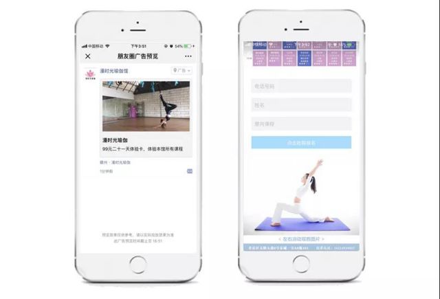 为推广其新开业校区,罗安拉通过“体验课”的活动快手小店商品形式,搭载预约试听表单组件获取用户信息,吸引用户到现场参与体验,进而促进线下转化。广告主题色彩选取与品牌调性相契合,画面排版清新简洁。 健身行业 漫时光瑜伽 漫时光瑜伽以外层采用瑜伽馆老师实景拍摄瑜伽动作,用户在观看视频时更具真实感,外层文案简明扼要,将活动与价格优惠直接传达。