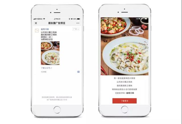 内层以白色为底,纯净透彻的视觉感受符合品牌调性,文案从品牌文化、课程体系和优惠活动三个方面展开,搭配课程图、瑜伽动作及表单组件,排版简约舒适,活动力度大,给用户非常优惠感,促进线索收集转化。 餐饮宝洁skii危机公关行业 益哥川味 益哥川味是一家地道的川菜馆,为推广其公众号,选择以图文形式广告在朋友圈进行投放,外层文案突出餐厅特色以及优惠活动,吸引用户点击;外层文字链“了解公众号”可直接跳转至公众号界面,方便用户关注。