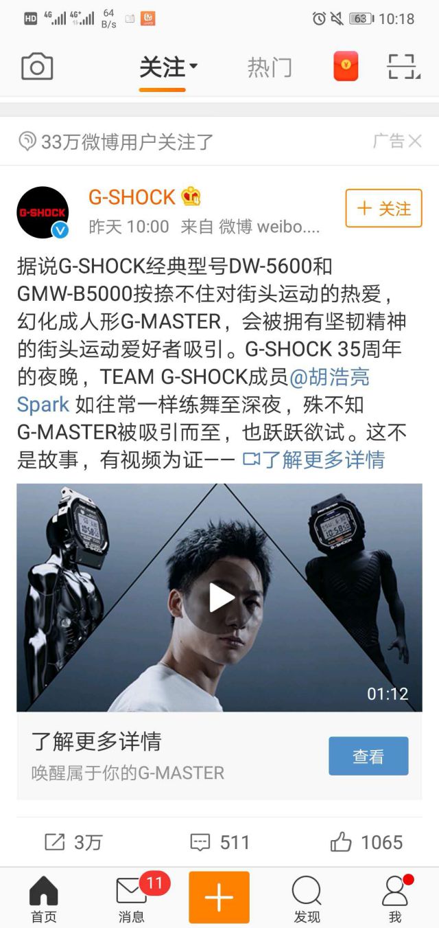 手表一般男性佩戴的较多,并且听过一句话手表象征男性的身份,G-SHOCK手表以创新,抗震概念和强大功能设计,在潮人们心目中赢得经典不可取代的地位。 新媒体推广课程G-SHOCK创造了前所未有的"防震手表"概念,以颠覆传统的姿态赋予手表全新概念,将音乐、运动、潮流、艺术等多元文化与年轻人的生活态度的空前结合,掀起了风靡全球G-SHOCK文化。 下面是G-SHOCK手表在微博投放的视频信息流广告样式,新款手表是运动风格,所以邀请胡浩亮代言,胡浩亮作为一个热爱运动舞蹈的年轻人形象,时尚潮流与时尚佩精准营销商品配置戴手表的风不谋而合。 广告微博投放效果显而易见,关注用户33万,二次转发3万,微博拥有海量用户资源,用户覆盖全国各个城市和地区,给微博广告传递提供了更广的范围,广告曝光高,能够吸引更多的意向客户和潜在粉丝 微博广告基于其强大的社交属性,广告主推广的的信息能够实现二次传播,并且二次传播不收取费用,对于广告主来说,性价比是非常高的 ![]()