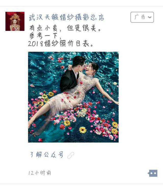 婚纱摄影广告一直以来是个神奇的存在,一般来说在抖音上存在的比较多,但是微信朋友圈似乎也是销售婚纱摄影类广告的一个汇聚地。下图是武汉天籁婚纱摄影总店的一个宣传广告,这个广告文案是我见过挺有意思的一个,“有点小贵,但是很美。参考一下,2018婚纱照价表”,这个广告文案让我有想点进去看看价格的冲动,很直接的告诉你,他们店很贵,让你有想去了解的想法看看到底有多贵。 今天我们就来分析一下婚纱摄影类广告在微信朋友圈做广告有哪些优势?<网络危机公关_良心哥/p> 首先,微信平台一般情况下都是成年人在玩,平台本身就排除了一些年纪较小的用户,他们对婚纱摄影类的广告可能不敢兴趣,可以说是没有这类需求,就节省了一部分的广告的费用,避免无需求用户的点击; 其次,微信已经是生活中必不可少的一个社交类平台,平常我们也多数运用它来进行支付,运用微信的用户非常的多; 最后,微博上有强大的定位系统,可以根据用户的行为特征来进行判断这个用户,给他投放较为感兴趣的广告,减少用户对看到广告的反感程度,现在这个不能浪费时间的时代,没有人愿意去多看一眼广告,除非用户本身对这个广告感兴趣。