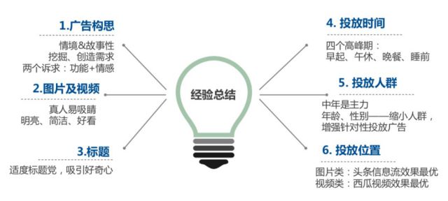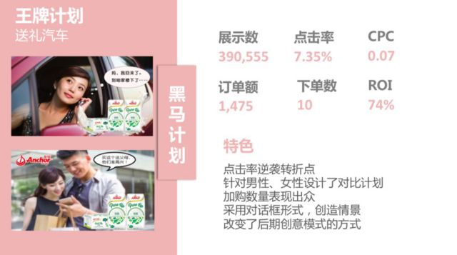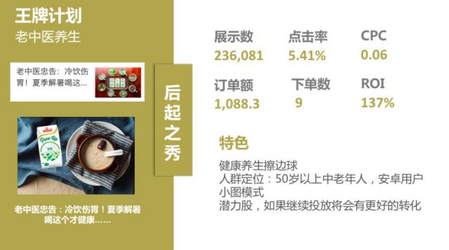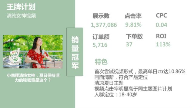 (节日热点) (中年人亲情) (精美小视频) 通过建立标题库进行创意优化,通过关键词延伸,把握用户痛点,如亲情倾诉、清纯女神、活动促销、母亲节、中医养生等方面,通过一次次的试投、总结,最终收获了销量冠军、转化冠军、黑马计划、后起之秀四个优秀的投放创意。