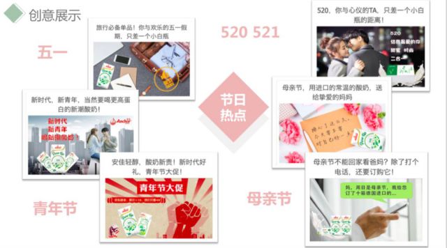 2、创意生产策略 在创意生产方面,本科第一小组从夏天、儿童、养生、老人、热点节日等关键点出发进行核心创意的头脑风暴,衍生出了一系列丰富且优质的广告创意。 创意展示