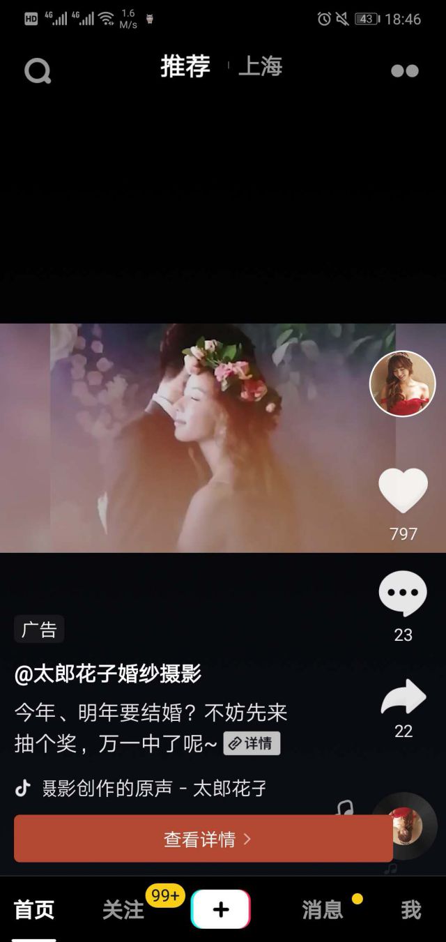 我们每个人是不是都想一生只有一次的婚纱,是与众不同的,选择一个好的影楼,找到适合自己的风格,结婚照是一种文化的传承,太郎花子风格秉承经典时尚路线,坚持大气、魏然引流奢华、简约、唯美、人文路线,专业经营摄影13年 太郎花子针对偏爱以纯色主题打造婚纱照的客户群,纯色背景墙的布景,更突出立体布光,注重新人的表现力,更能突出情侣之间的温馨与浪漫。婚纱摄影选择抖音投放广告,利用视频形式,让用户清晰直观看到婚纱拍摄效果,吸引用户目光。 抖音短视频拥有海量年轻用户是其特点之一,月活超过 2.5亿 ,日播放量超过 200亿,大多数为35岁以下的用户。这系列数据也证明了抖音与婚纱摄影人群的契合。 竖屏视频广告营造深度的场景沉浸。婚纱摄影消费者更注重图片、视频的视觉感受,抖音采用原生竖屏视频广告形式,比起横视频,全面竖屏视频,能带来更沉浸式的观看感受,这为婚纱摄影行业提供了深度场景沉浸的展现形式。除此之外,抖音广告形式原生性,支持转上海惊浪发,评论,点赞等行为,激发用户更多互动,更可为广告主抖音账户增粉。 广告购买方式上支持CPM(每千次曝药品广告允许含有光收费)、(点击付费)、(行动成本付费)多种计费类型,满足不同广告主的多元化需求。通过优质流量的智能挑选、转化模型的算法优化,系统性、精细化锁定转化人群。有效降低广告主的操作难度,让投放变得更快捷。