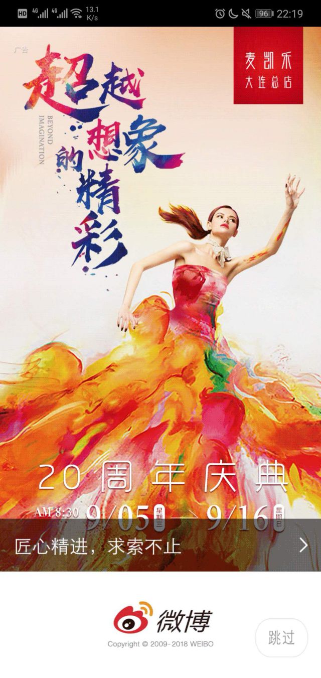 麦凯乐,是大商集团的新商号,起于日本,发展于大连,成功于大商,定位于高档精品流行百货,麦凯乐追求时尚、年轻的生活理念。 麦凯乐就像是一个集合国际一流民品、大型超市、休闲娱乐、餐饮酒店于一体的现代化高档百货店,女孩子没事时候就喜欢到处逛街,逛精品店,吃喝玩乐麦凯乐样样具备,此次麦凯乐选择在微博开屏广告投放广告,整个画面非常艳丽,色彩大胆搭配,20周年庆典,冷暖色调的搭配异常和谐。 微博卫视广告费拥有海量用户资源,用户覆盖全国各个城市和地区,给微博广告传递提供了更广的范围,广告曝光高,能够吸引更多的意向客户和潜在粉丝 微博开屏广告优点: 1.用户干扰小 2.抢占应用开启的“黄金5秒”,增强品牌记忆度,且广告更具权威性,让用户记忆更加深刻 微博开屏广小程序的吗告在用户打开微博APP时广告呈现,开屏广告的曝光效果是非常强的。一般开屏广告以图片样式或者动态图的样式展现,其中动态图的广告样式精准营销的怎么做视觉冲击力强,能够有效抓住用户的眼球,吸引注意力。 ![]()