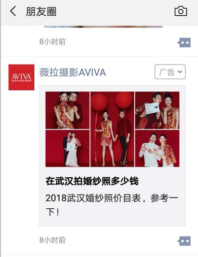 薇拉摄影关于市场营销策划是华中地区最具实力的高端定制婚纱摄影机构,亚太人像摄影金奖单位,依据国家统计局数据显示,初婚年龄推迟徐家汇至25-29岁,同时在2015-2019年,预估每年平均婚庆消费行业市场规模将在8000亿到9000亿之间,婚纱摄影的市场相当庞大。 面对那么火热的市场,新品牌的不断涌入,风格和创意不断翻新,所以婚纱行业竞争越来越激烈,如何在众多婚纱摄影中脱颖而出呢?婚纱行业定位人群20~39岁之间,她奥美公关国际集团们是网络重度且娴熟的使用者,生活信息习惯在网上获取,通常需求也通过网络得到满足,因此完美的契合了这一点。 下面这则广告除了非常红红火火的喜庆婚纱,还制造了悬念“在武汉拍婚纱照多少钱?”从而吸引用户。微信信息流广告以非常原生的形式在朋友圈广告中展现,对用户干扰很小,用户可以在维信广告中评论转发点赞进行互动。 营销的一个痛点,就是如何高效、精准地触达到目标用户。而有腾讯大数据的支持,微信朋友圈的营销推广就是达到这一目的的绝佳方法,让商家的宣传信息直达目标用户,缩短营销路径,用最少的钱带来最大的营销价值。 ![]()