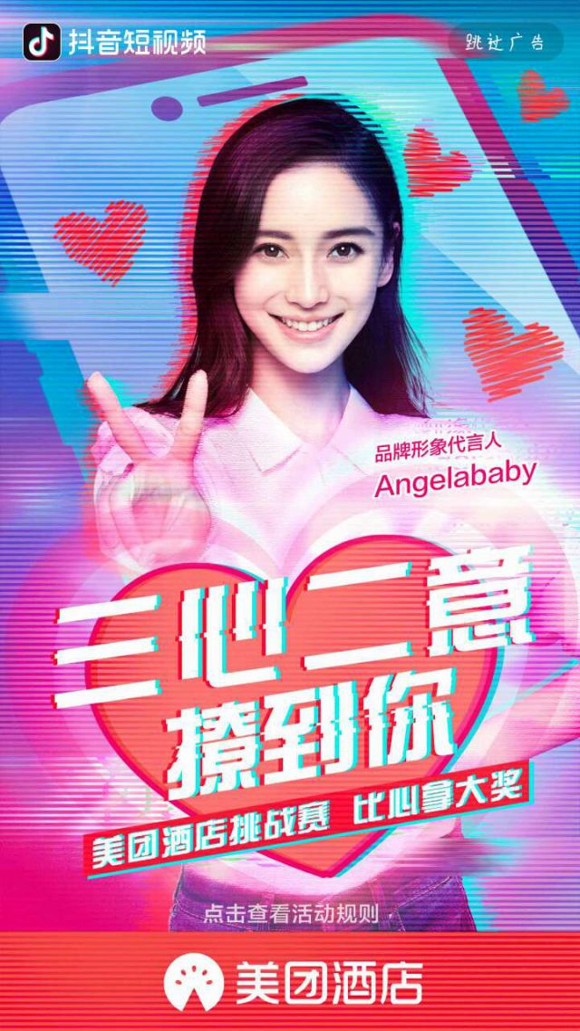 美团是一个一直以来的形象可能就是吃、喝、玩、乐,这里面我可能用过的只有吃了,美团外卖快快快。近日美团开始发展它的酒店行业,从上上周的七夕后,就开始主推美团酒店,甚至开始请了明星An合肥网络公关公司gelababy做品牌形象代言人。看起来美团想在吃喝玩乐上面再加一个住,开始借助美团的品牌名把酒店打入人的生活中。 美团开启三心二意撩到你,这是一个美团酒店挑战赛,比心拿大奖的游戏。广告投放在抖音的开屏广告上,微博上Angelababy也进行宣传阵容真的是非常强大了。在图片广告的下面有一行小字是点击查看活动详情,点击屏幕可今日美团详情页面。