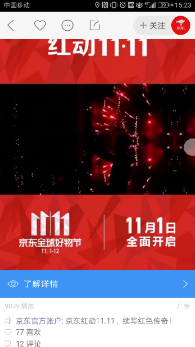京东在2017双十一期间也使用了快手的广告网络合作营销投放服务,落地页采用的京东双十一主海报,红色醒目,用户可以点击“了解详情”直接进入京东商城或者调起京东APP进行购物。 是可以插入外链或者调起第三方APP的,广告主可以在后台进行设置。 京东此次广告就是直接引导新用户进入双十一会场,如果是老用户的话,可以调起APP,让用户舆情团队在APP内进行购买,对于京东来说,这种广告不仅可以拉新,也可以激活那批沉睡的老用户。