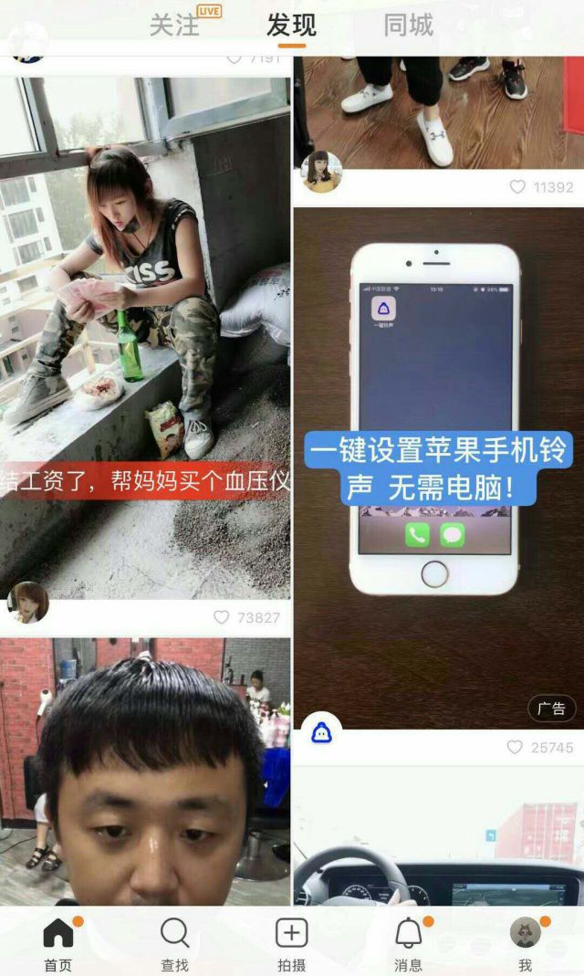 一键铃中梁营销策划声是一款iPhone端的手机铃声设置软件,在一键铃声中用户可以不用电脑设置,同时一键铃声还可以提取视频中的声音作为手机的来电铃声、短信铃声等,可以把抖音快手、网易云音乐、QQ音乐等中的神曲提取出来。另外一键铃声也有安卓版本的,通过一款APP就可以让你找到合适的手机铃声。 一键铃声放在了快手的发现页面上,右下角带有广告二字,表明这是一条信息流广告。如下图所示,广告描述特别简单,就是“一键设置苹果手机铃声,无需软文行推广电脑!”简洁明了,就是一款设置手机铃声的软件,广告目的当然是让用户下载这款APP。 一键铃声放置在快手的广告也是非常吸引人的,一般的APP都是苹果和安卓两用的,宣传苹果的的一键铃声就代表一定会有安卓版本的。看这个广告的爱心数已经达到了两万多,说明还是比较受欢迎的一款软件。 在快手上投放广告的优势 1、快手的用户基数众多,日活跃量可达到5000万,为我们产品的曝光提供了人数; 2、快手也是一个偏年轻化的一个短视频,87%以上都是90后,这也为一键铃声的推广奠定了基础; 3、精准定位,以用户平常爱看爱关注的一些视频,对用户进行视频推荐,以及广告的投放,不会让用户产生反感。