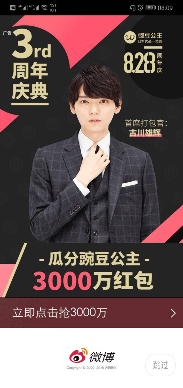 豌豆公主是日本供应商直接进驻的跨境电商平台,独家代理日商场策划营销本高端品牌。类似于中国的淘宝网,一个购物网站,像这种网站比比皆是,所以一个国外品牌想要在中国被人熟知,就需要投放广告,来增加品牌的曝光率和知名度。 豌豆广告选择在微博投放开屏广告,三周年,从广告的配色以及排版上很舒适,8.28三周年庆典,瓜分3000元豌豆公主红包,红色3000元在整个广告中非常亮色,吸引用户眼球。 选择微博开屏广告的优势 微博广告投放是企业品牌推广的首选,基于微博海量用户资源,企业品牌的推广信息能够触达更大范围的目标人群,实现企业价值,微博户覆盖全国各个城市和地区,给微博广告传递提供了更广的范围,广告曝光高,能够吸引更多的意向客户和潜在粉丝。 微博每天日活跃量很高,人们往往对第一眼看到的事物留下深刻烙印,在APP启动抓住整合营销如何策划用户第一眼,聚集360词条注意力。 ![]()