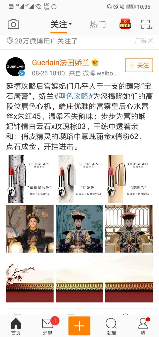 法国娇兰作为享誉全球的世界顶级香氛美妆保养品牌,法国娇兰190年以来,在传承法国皇室尊贵品质的同时,亦不断焕新前行,以天马行空的想象力,秉持“美·再进化”之理念,为世间无数爱美女性奉上型色各异、“美力”无限之臻致佳品,更为现代女性带去卓越奢华的至美体验。刚刚收官不久的《延禧攻略》不仅演员大火,连里面画的咬唇妆也是被网友连连称赞。 下面是法国娇兰在微博投放的广告,利用当下最热播电视剧来打响品牌。 富察皇后色:端庄大气,魅力十足的典雅朱红,完美契合法国娇兰ROUGE G臻彩宝石唇膏N45,对于职场女性而言,这管ROUGE G N45简直是出席晚宴抑或重要商务活动的必杀利器。 娴妃色:红中带褐,光泽润雅,与法国娇兰ROUGE G臻彩宝石唇膏N03可谓相得益彰,简约时髦、颇具中性魅力的独有唇色,可以完美营造出干净俐落的女性形象,无论是职场抑或日常,都是独立自信女蒙牛omp事件危机公关成性的至佳伴侣。 璎珞色:樱花般粉润可爱的唇色。法国娇兰ROUGE G臻彩宝石唇膏N62可谓是这份唇妆的绝佳代言,独家设计的魅力俏粉色调将欢快粉嫩的少女气息渲染十足—app产品宣传海报—无需过多粉饰,只需这一管唇膏,满满少女元气即触手可得。 明星的效应+热播电视剧为法国娇兰彻底打响了品牌,微博是一个最新话题传播最快的平台,基于海量的用户群体,以及粉丝效应,二次转发,广告的曝光率非常高,吸引了大量用户和潜在粉丝的眼球。 ![]()