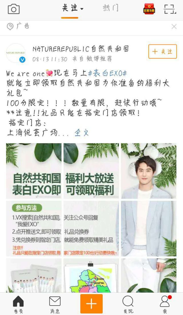 虽然大家对于EXO很熟悉,不过说起自然共和国可能很多人都会有点陌生,肯定会浮现一个大问号:自然共和国是一个什么牌子的产品?但是我们可能会认识他的英文名称nature republic ,自然共和国中最出名的产品就是芦荟胶。对于芦荟胶我们更不会陌生信息流广告渠道,只是对于自然共和国这个牌子的芦荟胶有点不熟悉,但是用起来还是不错的,我们可能用的最多的芦荟胶就是完美这个牌子的。自然共和国一晚间新闻直以来以绿色为代表颜色,绿色一种自然环绕、生机盎然,给予人无限希望的色彩。自然共和国和自然乐园不制造护肤品,只是大自然的搬运工。 自然共和国是一个韩国品牌,不过在微博上发布广告的是北京纳益其尔国际贸易有限公司。自然共和国联合EXO在微博上发布了信息流广告,广告的样式采用了九图拼接的模式,以#表白EXO#为话题,制作强有力的明星效应,引起大家的互动,带起这样的一个活石家庄 舆情监控动气氛。 参与表白EXO活动,就能在制定门店领取自然共和国为你准备的福利大礼包,100份限定。这个活动广告其实利用了微博投放广告可进行地域定位的这样一个功能,在广告主指定的地域进行广告的投放。 微博上的追星用户极多,尤其是前几年爆火的EXO这个团队,更是受到了广大年轻人的喜爱,像退出来的鹿晗、张艺兴都成了内地炙手可热的一线明星。这样就可以利用粉丝的力量,把这个活动推向热潮,让更多的人知道自然共和国这产品,当然不仅仅只是知道其中较为好用的芦荟胶,其他产品也是我们需要去了解。