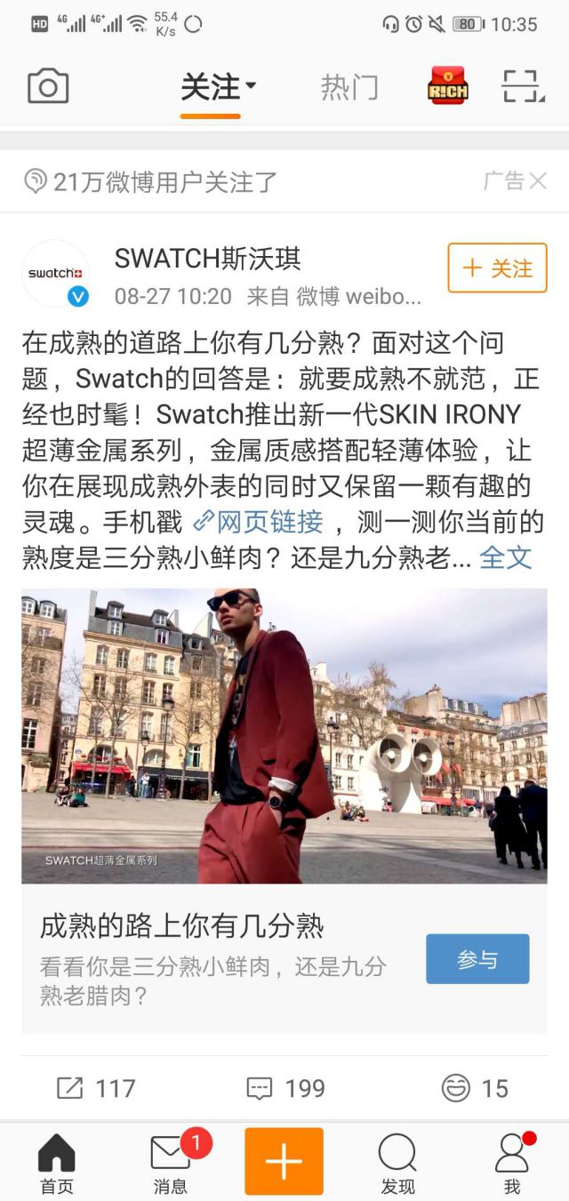 斯沃琪 Swatch诞生于1983年,由 Nicolas G. Hayek创建,是领先的瑞士钟表制造商,也是全球知名的时尚腕表品牌。1月1斯沃琪宣布王俊凯成为全球品牌形象代言人,斯沃琪在官宣时,该消息获得70万的转发,随着年轻一代的消费者崛起,品牌年轻化已经迫不及待,选择年轻偶像作为代言人,对品牌宣传以及销售额可以起到积极的促进作用。 斯沃琪SKIN IRONY超薄腕表,当年被誉为“世界上最薄的塑胶腕表”,风靡世界!该广告中以视频方式展现在用户面前公司推广软文例文,一个话题:在成熟的道路上你有几分成熟?斯沃琪邀请你一起测试几分成熟,以互动的方式带起用户的兴趣和注意力,呼应了当代年轻人的生活态度。 微博能基于所有的新浪微博用户精准定位投放广告信息,微博现在的用户偏向于年轻化人群,30岁以下网名占比80%,这类营销宣传推广人群个性、时尚、消费能力成熟。相比传统广告,微博采取信息流的方式推广,采用软文+视频的方式进行营销,与微博本身的新闻相融合,用户不会被打扰。海量的用户群体能够能品牌带来一定的曝光率和品牌的知名度。