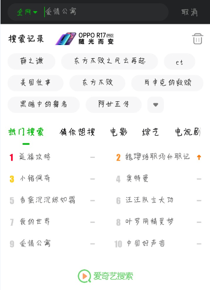 OPPO牌子的手机都是在未上映之前就把品牌打的沸沸扬扬,这是让全国人民都知道的节奏。在OPPO R15还在热卖的时候OPPO R17的要出售的广告开始横空出世。下面是一段OPPO R17的独白环节OPPO R17 拥有流光蓝、霓光紫、雾光渐变3种配色,全新幻色渐变,个性选择,6.4英寸水滴屏,91.5%的屏占比,顶部曲线如水滴公司要网站建设落下,光感屏幕指纹,闪速解锁,8GB+128GB全速运行,畅快体验.2500万AI智慧美颜,拍人,拍景更美。 OPPO R17打出的广告也就是随光而变,进行宣传这个产品的独特(这样是不是不能带手机壳了呀,就是为了炫外壳,不能盖住了……)。 OPPO R17的广告投放在我们点击爱奇艺去搜索时,搜索框的下面,如下图所示,紧接着出现在搜索记录的右边。看到这个我只想说广告平台真的是不想放弃一点点的能放广告的地方,这样一个小位置都要插放一个小型广告。 搜索框下的广告也算是一个广告的黄金位置了,每次我们去搜索的时候就可以看到。 广告的优势:首先,广告的位置非常醒目,点进来搜索的用户一定可以看到,广告被用户看到的几率可以说是100%;其次,广告达到率很高,适合提高我们旅游行业危机公关产品的知名度,尤其是像OPPO R17手机这样的宣传类产品。 广告的劣势:只有点进去搜索框才可以看到公关危机处理论文,不点进去看不到,这样就不如爱奇艺首页的一些通栏广告的展现量。