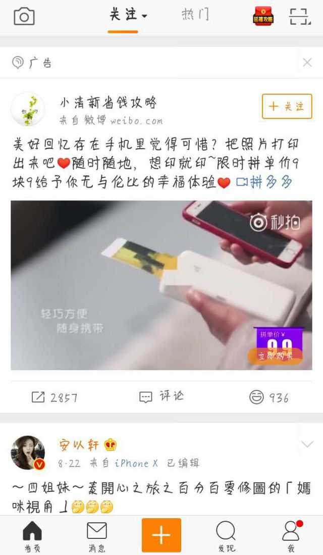 拼多多是一家专注于C2B拼团的第三方社交电商平台,成立于2015年9月。用户通过发起和朋友、家人、邻居等的拼团,可以以更低的价格购买优质商品。拼多多作为新电商开创者,致力于将娱乐社交的元素融入电商运营中,通过“社交+电商”的模式,让更多的用户带着乐趣分享实惠,享受全新的共享式购物体验。从一开始一亿人都在用的拼多多,到现在潘石屹 危机公关三亿人都在用的拼多多,不仅仅是拼多多东西的便宜,打的广告也是他们成功的主要因素,可见拼多多的广告魅力真的很大。 拼多多广告这次是放置在微博上,一个小清新省钱攻略的账号发布的广告信息。广告的形式是用秒拍来记录的一个小视频,视频内容是介绍拼多多上面的这一款产品,这款焦作舆情产品的主要目的就是打印照片,以“随时随地,想印就印”的广告语来吸引微博上众多的网友们。 拼多多这款产品在微博上打广告的原因大概分析了以下几点: 1、微博上的用户多是众所周知的,不光光可以宣传这个产品,更重要的是转化跟踪宣传这款产品的平台。 2、微博用户年轻,喜爱拍照、游玩的用户异常的多,这样一款可以洗照片的工具正好受到了广大网友的青睐。 3、这款产品的价格显示拼单价9.9元,可能更多人会觉得很便宜,想买回来看看,抱着试试看看的心态,增加产品的卖出率。