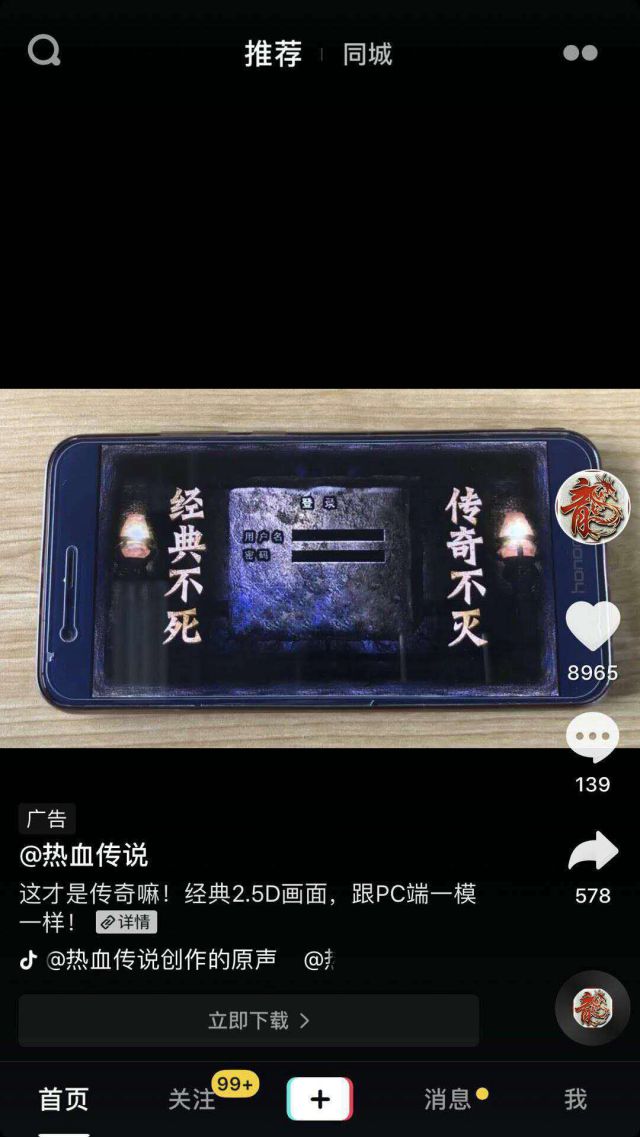 热血传说又称为复古传奇是首款及时战斗 RPG网页游戏 ,一个复古的传奇类游戏,被称为最为经典的皇城对决。以“经典不死,传奇不灭”为口号,在2009年就进行了封测,算是一款比较老的游戏,阿里巴巴 危机公关一直未被淘汰,肯定也有他的特别之处吸引着玩家,背后的团队肯定也下足了功夫。 近期热血传说跟着其他游戏打广告的热潮,也在抖音上放置了广告,“这才是传奇嘛!经典2.5D画面,跟PC端一模一样”为标题,用一贯传奇的套路,来去吸引用户。 那么的广告平台,为什么热血传说选择抖音这个短视频平台呢? 1、抖音在短视频中用户占据量已经达到最多,日活跃数逐渐增多,是一个宣传产品的良好平台,有效的增强我们游戏的知名度; 2、据调查显示抖音的用户男性多于女性,用户年龄也偏小,85%以上的都小于24岁,而我们游戏的定位大概也是这个年龄,主要针对于年轻人设计的一款游戏; 3、抖音都是以短小视频的方式来发布广告,热血传说很好的利用了这一点,内容分发网络把游戏的优点全部凸显出来,这样的效果肯定要比图片的展示效果好; 4、抖音平台本身就可以说是“游戏”的一种,大家都是在闲暇的时候刷抖音或者去打游戏,在一个相似平台上做广告,是一个非常明智的选择。