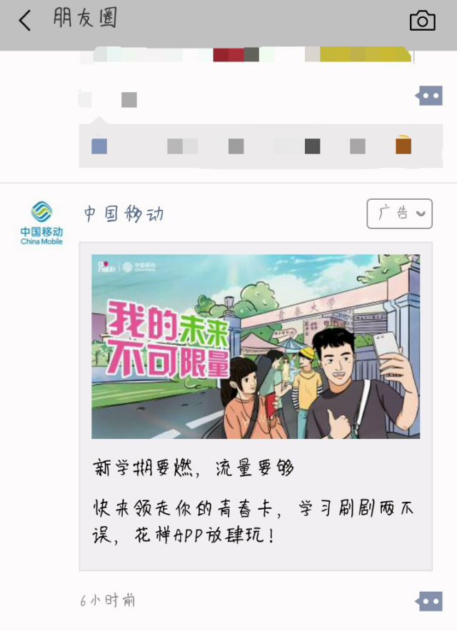中国移动大家都知道,这已经是一个大众的品牌了,主要是为用户提供业务介绍,手机话费充值查询……一系列手机服务。随着中国联通、中国电信的发展,中国移动也开始有了自我防范意识,朋友圈内以快开学为话题,引导办理新卡投放了品牌广告。广告是图文相结合的方式,上面是“我的未来,不可限量”的图片,图片下方是介绍中国移动套餐的优点,主要的意思是新学期办理青春卡,流量不限量。 这对众多的上学族来说是非常具有吸引力的,现在的手机没有流量就完全没有用了,流量用超过后扣的费用又特别高,尤其是现在都是智能机,流量用的飞快。广告以流量为切入点,还是非常吸引现在的众多年轻人。 看到标题肯定会有一部分小伙伴们疑惑什么是品牌广告,品牌广告是指企业为了提高市场占有率、树立产品品牌形象投放的广告。品牌广告往往被人们称为“注意力经济”,旨在唤起消费者的注意及兴趣,树立企业或者产品的品牌形象,这需要大量资金的投it新闻稿发布入,广告的反复播放,以帮助消费者形成记忆。由于其距离消费者最终的购买行为比较远,其过程控制异常复杂,而结果一般也难以衡量。 微信是基于微信公众号生态体系,以类似朋友的原创内容形式在朋友圈中展精准整合营销示的原生广告。用户可以通过点赞、评论等方式进行互动,并依托社交关系链传播,为品牌推广带来加成效应,按曝光次数计费。