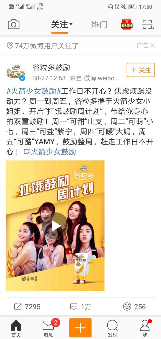 谷粒多是伊利首款天然谷物与牛奶结合的产品,伊利"谷粒多&quo危机公关外部环境分析t;谷物奶,为中国消费者提供了一款可以随时随地营养一餐的最佳选择,以牛奶+谷粒的健乐收推广康饮食结构将成为众多现代人士代餐首选。 下面是谷粒多在微博投放的广告,以微博视频信息流方式进行展现,以最近挺火的火箭少女作为话题,推出周一到周五不一样的谷粒多,工作再忙也要记得早餐,广告效果很不错,74万用户关注,评论、转发、点赞效果总体来说不错。 微博拥有海量用户资源,火箭少女的加入使得粉丝对这个品牌的关注增加,微博用户危机公关应该措施覆盖全国各个城市和地区,给微博广告传递提供了更广的范围,广告曝光高,能够吸引更多的意向客户和潜在粉丝。微博广告基于其强大的社交属性,广告主推广的的信息能够实现二次传播,并且二次传播不收取费用,明星在微博有忠实的粉丝,这些粉丝会进行二次宣传,对于广告主来说,性价比是非常高的。 ![]()