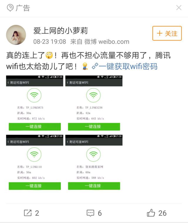 小提示:您应该对本页介绍的“微博广告中竟然还有腾讯wifi的广告”相关内容感兴趣,若您有相关需求欢迎拨打我们的服务热线或留言咨询,我们尽快与您联系沟通微博广告中竟然还有腾讯wifi的广告的相关事宜。