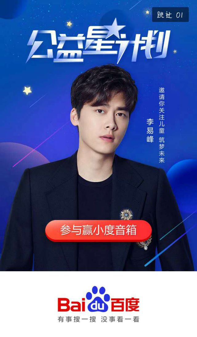 公益星计划是百度联合明星一起做出的一个活动。活动从8月8号就已经开始,每周将有一位明星作为公益发起人为活动打call,网友可以成为筑梦者,和自己喜欢的明星一起为贫困地区的孩子献爱心。为了配合百度公益“筑梦未来计划”电商仓储代运营,让贫困地区的孩子们得以享有平等获取知识的权利,本次活动借助百度本身的影响力、各位明星的号召力,通过全民公益的形式,实现了爱心的传递。 每次百度都配合进行宣传,这周的明星是李易峰,广告是百度的开屏广告,作为百度的开屏广告还是比较吸引用户的注意力,加上如果是自己喜欢得爱豆,效果还是非常显著,让更多的人关注到这次公益活动,关注儿童,筑梦未来。百度的影响力还是不同凡响的,毕竟作为中国最大的搜索引擎平台,日用户量最高可活跃到2亿,数字及其庞大,活动的客户标签与精准营销曝光力度也就相应的会取得非常不错的成绩。如果你也想投放百度广告,欢迎前来咨询。 最后再跟大家介绍一下这个活动如何参加,有兴趣可以去看看,活动还在进行中,活动参与方式十分简单,网友在百度APP上登录百度账号后,进入“公益星计划”活动页面,就会有星星出现自动点亮图片,参与者即成为筑梦者。筑梦者不仅可以获得自己的筑梦证书,也可以将活动分享给朋友继续传递爱心,邀请更多的人加入活动。