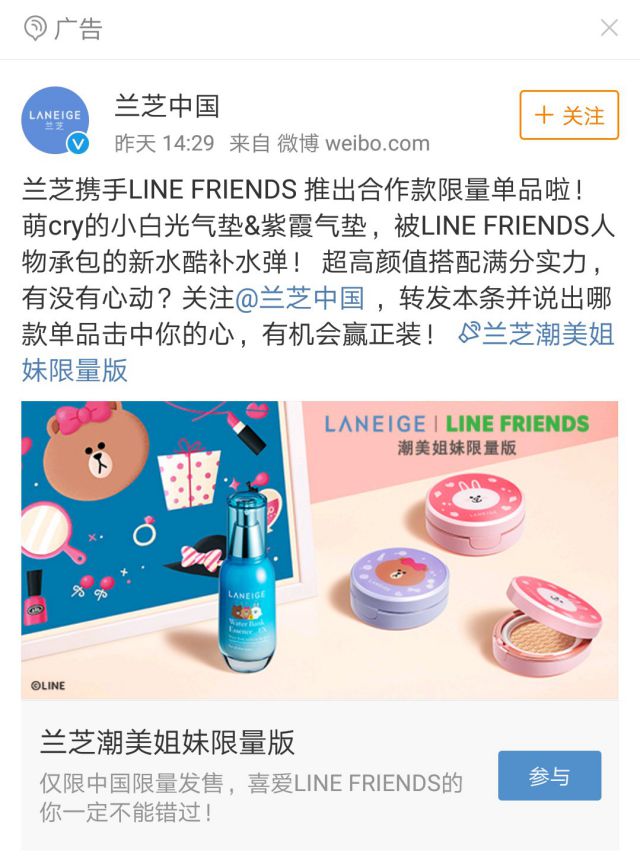 兰芝号称“韩国销售冠军、“水分专家”的护肤及彩妆品牌Laneige,成立于1994年,名字的法文意思是“雪”,旨在赞美女人“肌肤胜雪”,充满水分和光泽;护肤系列走“水”之路线,高效保湿净化肌肤,打造“水汪汪”健康肤质;彩妆,则以“光”为代表,令女性神采飞扬、凝亮璀璨。 兰芝所追求的是一群自信、自爱的现代女性,沉着冷静却又不乏热情,自然快乐但又不失精致,职业优雅中带着自由奔放,兰芝是全球宣传片视频素材年轻高档化妆品牌,深受全球年轻女性喜爱,兰芝品牌的目标消费者针对白领一族。 此次兰芝选择在微公关的定义博投放广告,借助微博这个流量话题平台,将兰芝限量单品,萌cry的小白光气垫&紫霞气垫,和微博用户进行互动,转发并说出那款单品击中你的心,就有可能赢正装! 在微博这个拥有海量用户的平台,兰芝又是女性都会关注的一个产品,给微博广告传递提供了更广的范围,广告曝光高,能够吸引更多的意向客户和潜在粉丝。