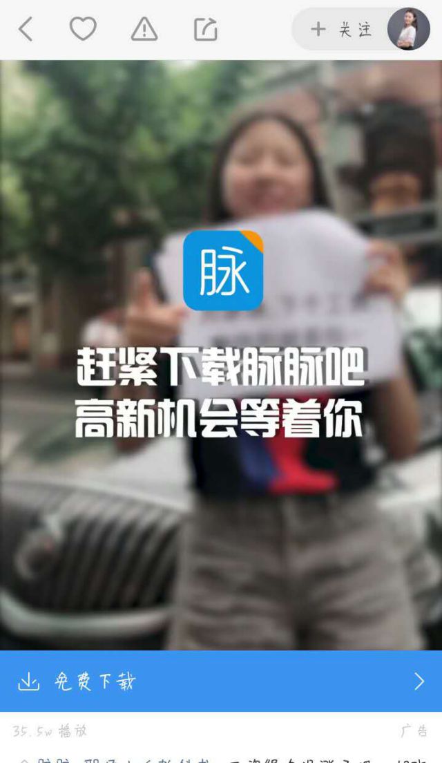 脉脉是一款利用科学算法为职场人打通人脉、打破行业壁垒、降低社交的门槛、实现各行各业交流合作的职场社交APP,中国领先的职场实名社交平台,是在2013年十月开始上线,,由北京淘友天下技术有限公司开发。脉脉帮助职场人通有哪些渠道可以推广过工作圈进行高效的工作交流,掌握行业动态,分享职场经验和话题观点;最大的特色就是通过匿名来吐槽爆料获取行业内幕、同行薪资及公司八卦;通过找人办事拓展人脉,实现跳槽、挖人、找钱、找关系等,可以说是工作上的微信社交软件。 脉脉广告CCTV-4投放在快手上,封面图是一个女生拿着一张纸,纸的上面写着之前工资4500,吸引我们想看下一步,现在的工资呢,进行引导我们。点进广告是一个关于脉脉的小,下方有免费下载的字样,并且在你观看完广告之后,会出现下载脉脉的落地页。 脉脉广告主要是针对一些刚刚迈入社会的上班族和一些喜欢社交的白领们,快手这个平台虽然大多数用户位居与三四线城市,但是工作是每个人都必须要做的,这种社交性的软件还是必不可少,快手用户多数偏于25岁,正好是上班与社交刚好的年纪,平台用户非常的吻合。