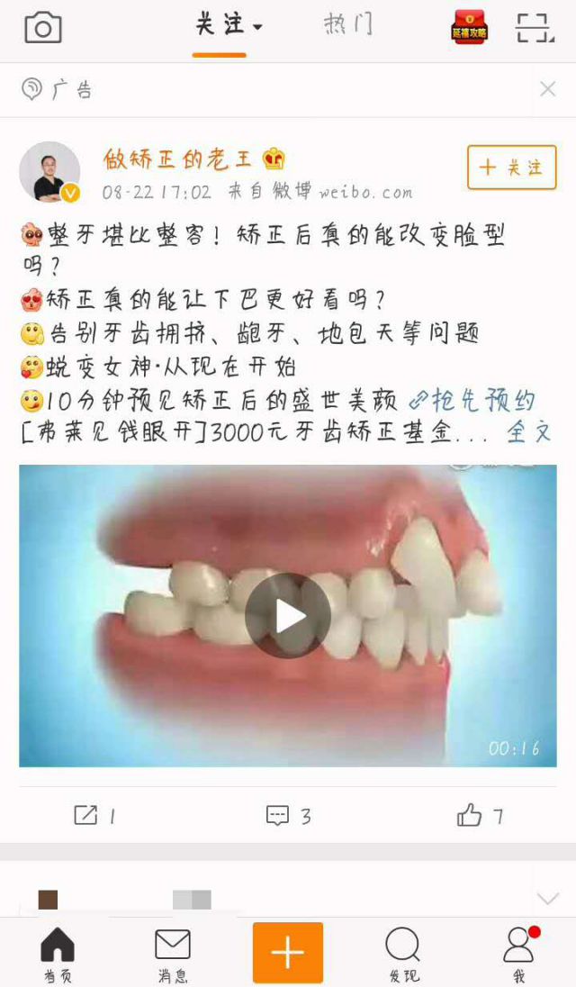 还记得很多明星因为脸宽,悄咪咪的去拔掉了后槽牙,做牙齿矫正真的有那么重要吗?微博上的这个广告告诉你是非常重要的,牙齿矫正可以更改面部的形状,这个整改真的是整容都做不到的。这个微博广告的文案是挺长的一个了,主要是告诉我们矫正牙齿堪比整主要信息流广告容,进行预约可以赢得3000元牙齿矫正基金,让你们回归盛世美颜。 盘点一下微博广告的优势: 1、微博上以信息流广告的形式来进行展现,信息流广告都是穿插在内容之中,不会那么容易被用户发现,用户的体验感比较好; 2、微博上具有海量的用户,在这个信息化的时代,可能更好的利用人们的碎片化时间,进行刷微博这种行为,从而引发网友看到广告的几率,是最有影响力的平台之一; 3、微博广告的到达率非常的高最右推广,几乎都会被用户看到,传播速度也不是其他平台所能比的; 4、进行精准投放,多维度、多属性地精准定位目标人群;支持年龄、性别、地域、兴趣等多种条件组合,以及高级数据功能;大幅提高广告转化率。 5、微博广告随时随地都可以进行发布,传播力度非常快,因为互动力度高,进行转发的人数可以导致我们产品的二次曝光,传播范围呈几何倍增长,吸引更多的优质粉丝。