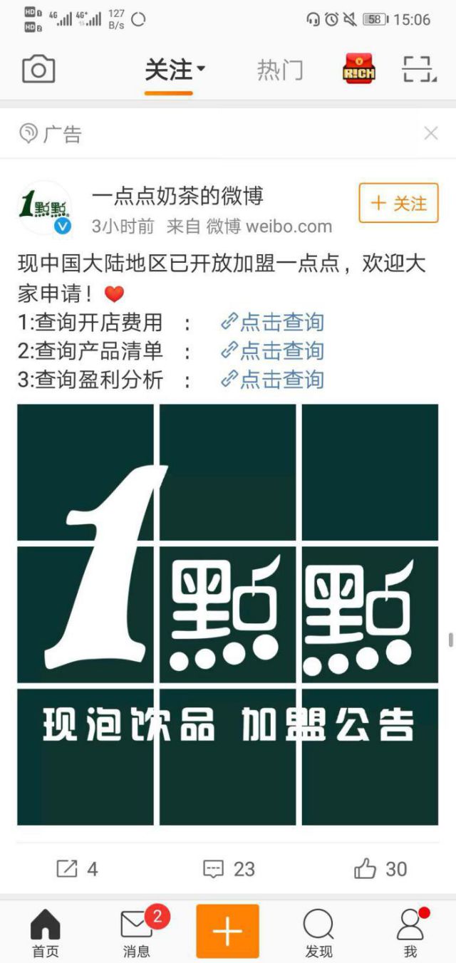 一点点奶茶大家应该都不陌生,以美味健康茶饮著称,现在人们追求健康、人性化、个性化的休闲餐饮,而一点点奶茶正式其中一员,一点点奶茶相对其他餐饮品牌具有低脂、低糖的饮食结构,顺应了新时代人们健康饮食的潮流。 品牌优势:全国火热的奶茶饮品店,个性鲜明的品牌形象 一点点在微博投放广告,以九宫格格式拼成一点点奶茶logo标志,让用户再刷微博时一眼就能看到,邀请大家加盟一点点奶茶。对于加盟奶茶店有兴趣的进行开店费用查询、产品清单查询、盈利分析查询,将目标客户所疑惑的一一解答。 基于微博拥有的海量用户资源,用户覆盖全国各电商经营方法个城市和地区,给微博广告传递怎么找淘宝直播提供了更广的范围,广告曝光高,能够吸引更多的意向客户和潜在粉丝。 微博广告基于其强大的社交属性,广告主推广的的信息能够实现二次传播,并且二次传播不收取费用,对于广告主来说,性价比是非常高的。 ![]()