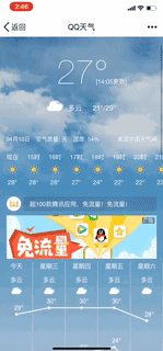 其中,兰蔻QQ天气投放日均达到2%~3.5%,阿尔卑斯在消息面板植入也和场景融合很好。投放效果之所以那么显著,其实可以归功于QQ天气与众不同的特色投放形式,根据四季、雾霾、阴雨、晴天和下雪等不同气候,露出不同的banner素材和文案。 创新广告形式,让用户体验更佳 QQ天气也推出了新颖形式的随心互动广告,广告素材会随着页面滑动动效切换,点击素材即可跳转到相应链接页面。在内容页还有视窗广告,当用户上下滑动时,广告区域不变,视窗内图片内容会随着滑动而变化。