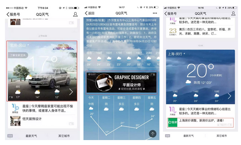 从左到右依次是:QQ天气背景、内页视窗随心互动、日常推送次条 数据显示QQ天气作为用户日常基本需求之一,不止是年轻的QQ深度用户,对上班族的吸引力更大,30到50岁的用户占到36.64%,本科以上用户为39.85%,QQ天气高度聚合了QQ的成熟用户,他们的购买力更强,带来的点击和转化率也更高,这样高效的广告位,不要错过呦!