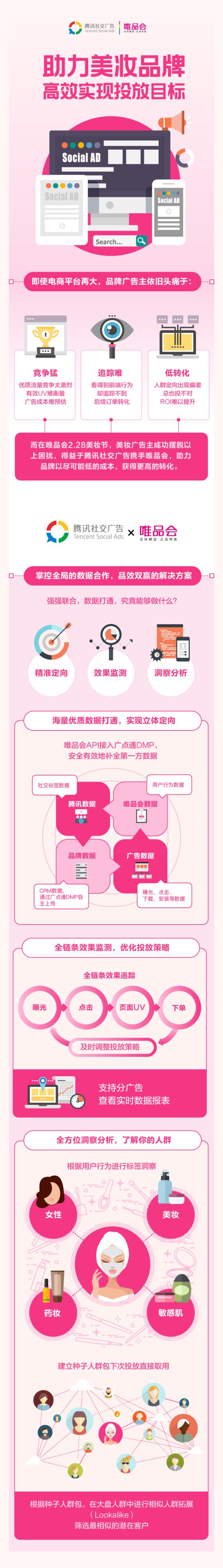 腾讯社交广告携手唯品会,助力营销“大有可唯” 腾讯社交广告与唯品会合作长达五年,腾讯社交广告为唯品会在多个优质流量中获取新客,在各个优质媒体中的用户渗透率逐年升高,目前已经累积庞大的用户人群,也积累了丰富的投放经验。 腾讯社交广告将与唯品会开展更深度的战略合作,通过搭建更广阔的资源矩阵、利用更强大的数据能力、更高效的产品工具,为品牌广告主带来更优质的投放体验和转化效果。 广阔的资源矩阵,更宽广的拓客渠道 微信朋友圈、QQ空间、腾讯视频、手机版QQ购物号等&CPM资源,协同微信公众号、腾讯广告联盟等RTB、PDB资源,汇聚更大流量池,贯穿用户24小时真实生活。 强大的数据能力,打造更开放的智能营销生态 10亿腾讯社交大数据,协同唯品会购物数据和广告行为数据,从多个维度洞悉用户特征,保障广告的购物转化与再营销效果。广告投放后,可对人群进行数字营销办法洞察,定位显著特征标签,以便下次投放备用,持续优化广告投放效果。还可通过对种子人群包进行Lookalike相似人群拓展,寻找与种子人群最相似的潜在人群。 不仅如此,协同唯品会不断进行机器学习模型、数据处理及数据价值挖掘、实时计算能力的升级,给予广告主更好的投放体验。 唯品会高效产品工具,助力“唯妙唯效”的营销效果 从便捷的投放平台,到强大到数据管理平台,再到投放效率提升工具,唯品会旨在腾讯社交广告的加持下,构建一个更加开放、共赢的营销体系。 唯品会的智能营销平台投放端不仅能够解决高效投放,从广告直达品牌专场,还能自动实现动态广告创意的生成,向不同用户展示最感兴趣的广告内容。唯品会深链直达功能缩短用户浏览和购买路径、动态广告助力再营销效果优化,可提升高达300%。此外,oCPX出价方式以快速、智能的实时计算,使广告主可随时根据自身推广的预期转化成本进行出价,直接帮助广告主在成本可控的情况下获取更高的转化量。 放眼未来,腾讯社交广告将继续与唯品会紧密合作,通过更加开放的互联网技术和能力,在构建双方智能营销生态的同时,帮助品牌实现营销目标,在新消费时代共创商业价值。