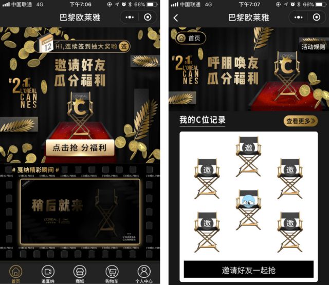 为了进一步提升小程序的“运营深度”,巴黎欧莱雅特意推出了“签到赢大奖”和“抢C位得红包”活动,一改过去人们对于小程序“用完即走”的固有印象,通过“点击签到得优惠”这样一个简单的方式提升小程序粘性;而“抢C位”更是将微信的社交裂变能力发挥的淋漓尽致,邀请好友共同分享品牌福利,以“强驱动”的方法带来品牌关注度和用户量的快速爆发。