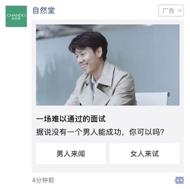 朋友圈相对纯净的广告环境,为品牌与消费者进行深度沟通创造了良好的空间。据微信广告数据显示,该广告原生落地页访问时长最长达105.2秒,最短的也超过90秒,也就是说只要点击进入广告内层的人,几乎都看完了一半以上的视频内容。 直戳内心的价值观交流,朋友圈熟人社交激起共鸣涟漪 朋友圈是私人化的熟人社交环境,广告内容能够让品牌与用户像朋友一样深入地进行交流,交心式地传达两者间的价值观与内心想法。 另外,朋友圈的呈现与推送逻辑能够帮助用户在现实中找到更多“志同道合”的朋友,一起探讨、交流热点话题。一旦用户在这条广告下点赞或留言之后,他的好友只要同样表示了对这条广告的兴趣,那他就会收到提示——这就好像品牌拉了一个群,让用户和所有共同感兴趣的朋友一起来讨论这条广告。 这样的社交讨论会进一步放大广告内容带来的情感共鸣,促使你觉得点赞已不足以表达,要转发分享让更多人分享你的所读、多见、所感。 根据朋友圈广告的推送算法,积极的讨论也会让用户同一社交圈中的其他好友有更大几率收到这条广告,于是这个“品牌讨论群”就会变得越来越大,基于这个广告的圈层讨论,就会逐渐演变成朋友圈热门话题,自然堂案例便成功激起了这样情感共鸣涟漪。 “互撩”游戏下的强用户互动,“交心”粉丝的正确打开方式 社交媒体时代,营销就是一场互“撩”游戏,是品牌自下而上地与用户进行交融、互动。 自然堂在朋友圈中采用了选择式卡片广告形态,来撩动用户主动参与的冲动,为创意观点的表达和广告的点击率加了分。在广告外层,用户会看到一句充满悬念的文案“没有一个男人可以通过的面试”,以及分别属于男女性的“男人来闯”和“女人来试”两个按钮。人们根据性别的差异,会本能地代入自己,从而产生进一步的点击参与欲望,有效提升广告的点击率。使得该广告原生落地页进入率高于行业均值72%,表现十分出色。 微信广告数据显示,在分别针对女性和男性人群定向投放时,相应按钮的点击率差异明显,如在投放女性人群时,“女人来试”是“男人来闯”按钮点击率的5倍,标签引导点击非常有效。在广告创意与朋友圈广告的双重加持之下,本次广告通过社交分享带来了8%的额外曝光,远超过行业均值,这意味着自然堂仅靠微信上用户的主动转发就零成本获得了数百万曝光。 在3月8日朋友圈广告投放那几天,自然堂微信公众号涨了近1万粉丝,是近期涨粉表现最好的时段。值得一提的是,这些粉丝是真正认同自然堂品牌价值观的“交心”粉丝。