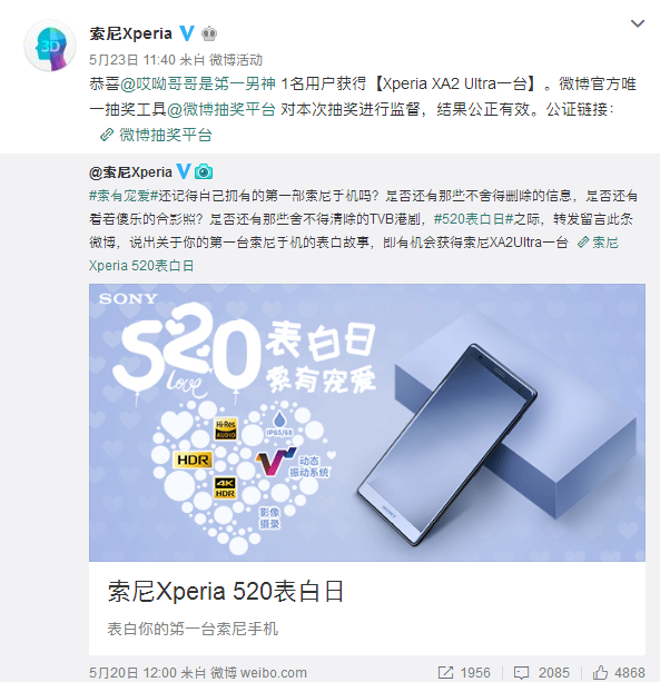 在520这天,索尼官微发出好几条转发有奖的博文,充分调动粉丝积极性,实现品牌精准营销推广系统传播,同时还提升了粉丝对品牌的信任感。 有效抽奖,诚信无欺