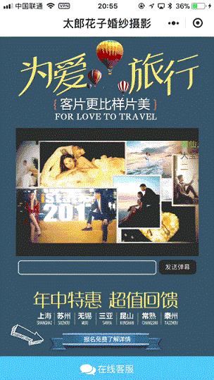 2、内层多元素材+新颖互动形式,提升客咨有效率 太郎花子的目标用户年龄介于20-35岁,有着追求个性消费,消费观念开放,有着稳定较高的收入的特点。这部分人群更倾向直观生动的广告展现形式,而小程序可以自由定制样式形态的特点,正精准契合了目标人群的体验需求。太郎花子通过“个性化视频+精美样片”的展现形式,打破了婚纱行业创意同质化的局限性,成功吸引了用户目光,提升了用户对品牌的好感度。 与此同时,太郎花子还使用了新颖的视频弹幕互动形式,进一步激发粉丝互动热情。再通过落地页中位置明显的“表单+电话+在线客服”的多种沟通方式,获得月填单量4000+,成交量750+,客咨有效率82%的好成绩,远高于行业平均水平。 太郎花子小程序落地页