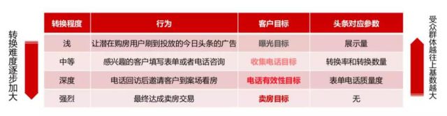 除此之外,中海凤凰熙岸客户本身在广告投放上有过一定经验,并具有以下三个方面的特点: 第一是投放经验丰富,线上和线下两种渠道都有涉及,线下渠道包括:地铁广告、公交广告、商场广告、传单广告、渠道分销广告等。线上渠道包括安居客、链家各类房产app的广告、今日头条等。 第二是不同于其他房产客户,中海客户除基本的曝光要求外,更加注重广告投放的效果,即销售线索、电话、表单等方面。 第三是预算有挖掘空间,虽然投放的总预算有限,但是在各家广告渠道的投放预算会受投放效果的好坏而增减。 因此基于上述的这些优势卖点和投放经验,广告主提出了四个方面的投放目标,包括曝光、收集电话、电话有效性和卖房目标。头条的优化师针对客户的投放现状及需求为其制定了及优化方向,因为前三个目标都是为第四个终极目标卖房铺垫的,并且从第一个目标到最终目标,转换程度难度逐步加大,受众面也越来越小。因此尽可能引导广告主做好前三个目标,卖房自然水到渠成。