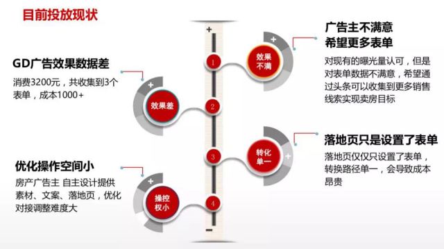 但当理论落实到实践中,一些初期阶段的问题也逐渐显现,首先是成本贵,每个表单成本达到1000元+ ,其次是表单少,甚至出现个位数表单。客户的四个投放目标,目前也只完成的最初级的曝光目标,收集电话目标和电话有效性目标都没有完成,更不用说终极卖房目标。这些问题导致广告投放的现状堪忧,主要体现在GD广告效果数据差、广告主不满意,希望更多表单、优化操作空间小、落地页只是设置了表单四个方面。