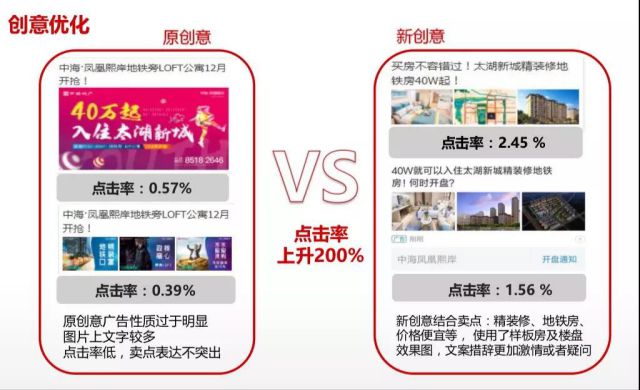 2、创意优化 以前的创意由广告主自己提供,广告意图特别明显,标题也较为生硬,卖点不够突出。经过优化调整后,将房产的精装修,地铁房,价格便宜等优势通过样板房和楼盘效果图展现出来,文案措辞也更吸引人,整体点击率得到明显的提升。
