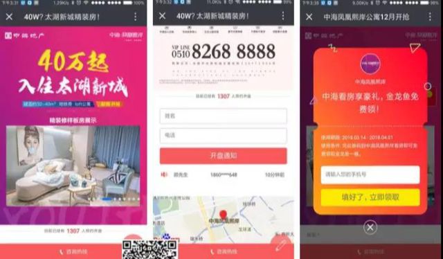 3、落地页优化 其中包括页面布局优化和表单按钮文案优化,在页面布局优化中主要涉及到四点,价格优势头图展示、新增样板房轮播图、新增卡券组件、增加咨询电话和地图搜索组件,将房产价格低,精装修,位置佳的优势进一步展现。