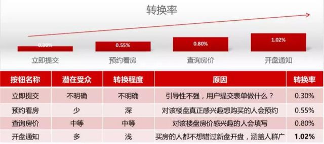 在落地页表单按钮文案优化中,由于表单按钮文案决定了填写表单的人群的意向度,进而影响了转换率。因此优化时分别进行了立即提交、预约看房、查询房价、开盘通知四种文案测试,最后综合表单按钮转换率,“开盘通知”或者“查询房价”是转换率较高的选项。
