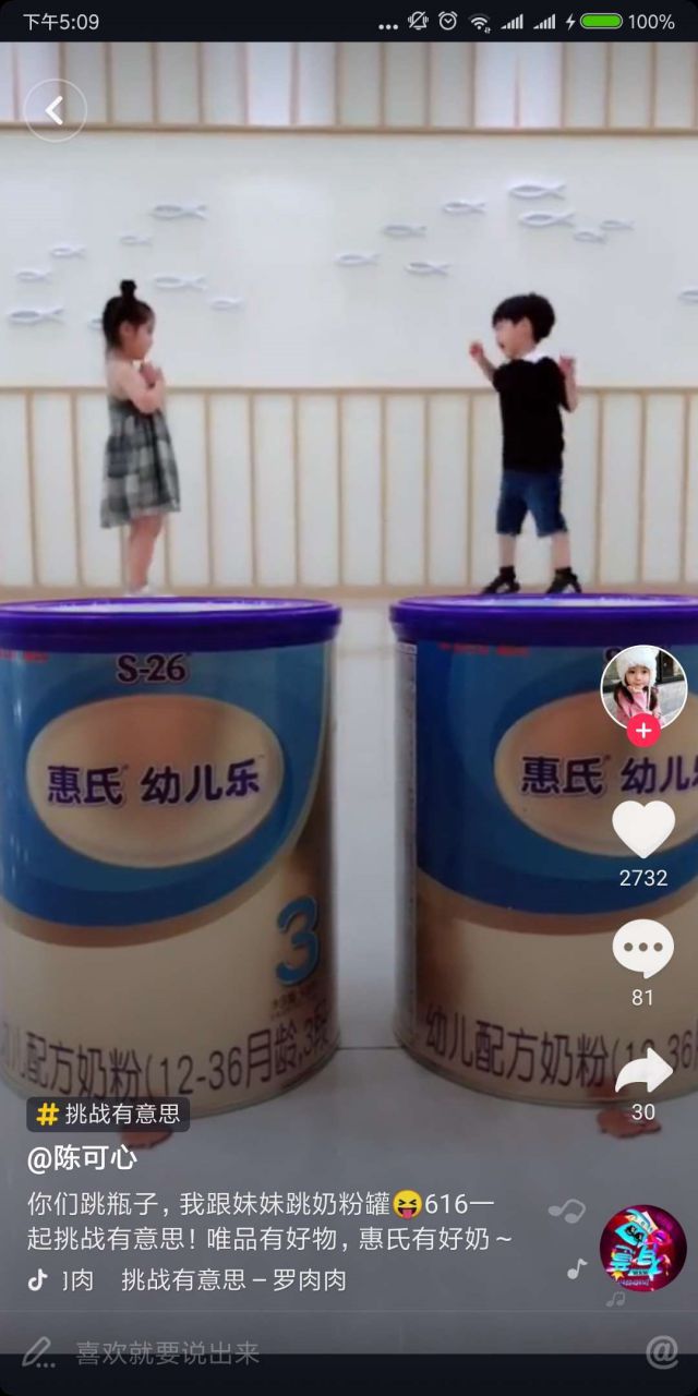 与其同时,惠氏在抖音同步发声,邀请萌娃达人@陈可辛参与唯品会挑战赛,以抖音热门的跳一跳玩法植入惠氏奶粉,狂揽108,936播放量。惠氏奶粉的曝光量也因此大增,据悉,挑战赛开赛当天,惠氏在唯品会上的品牌销售额达到日均10倍,增长惊人。